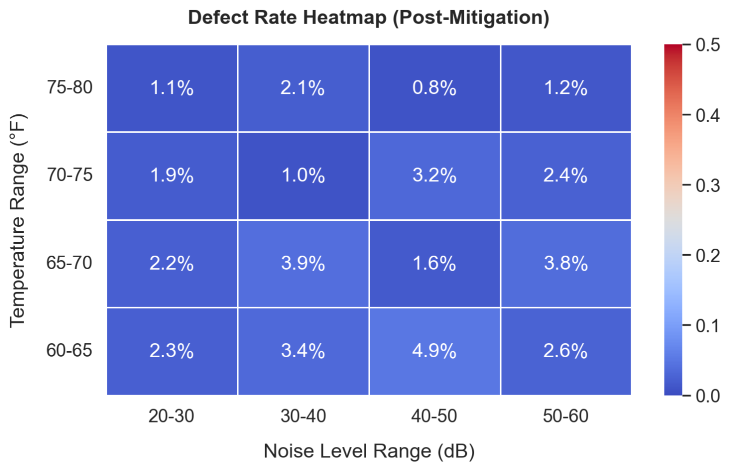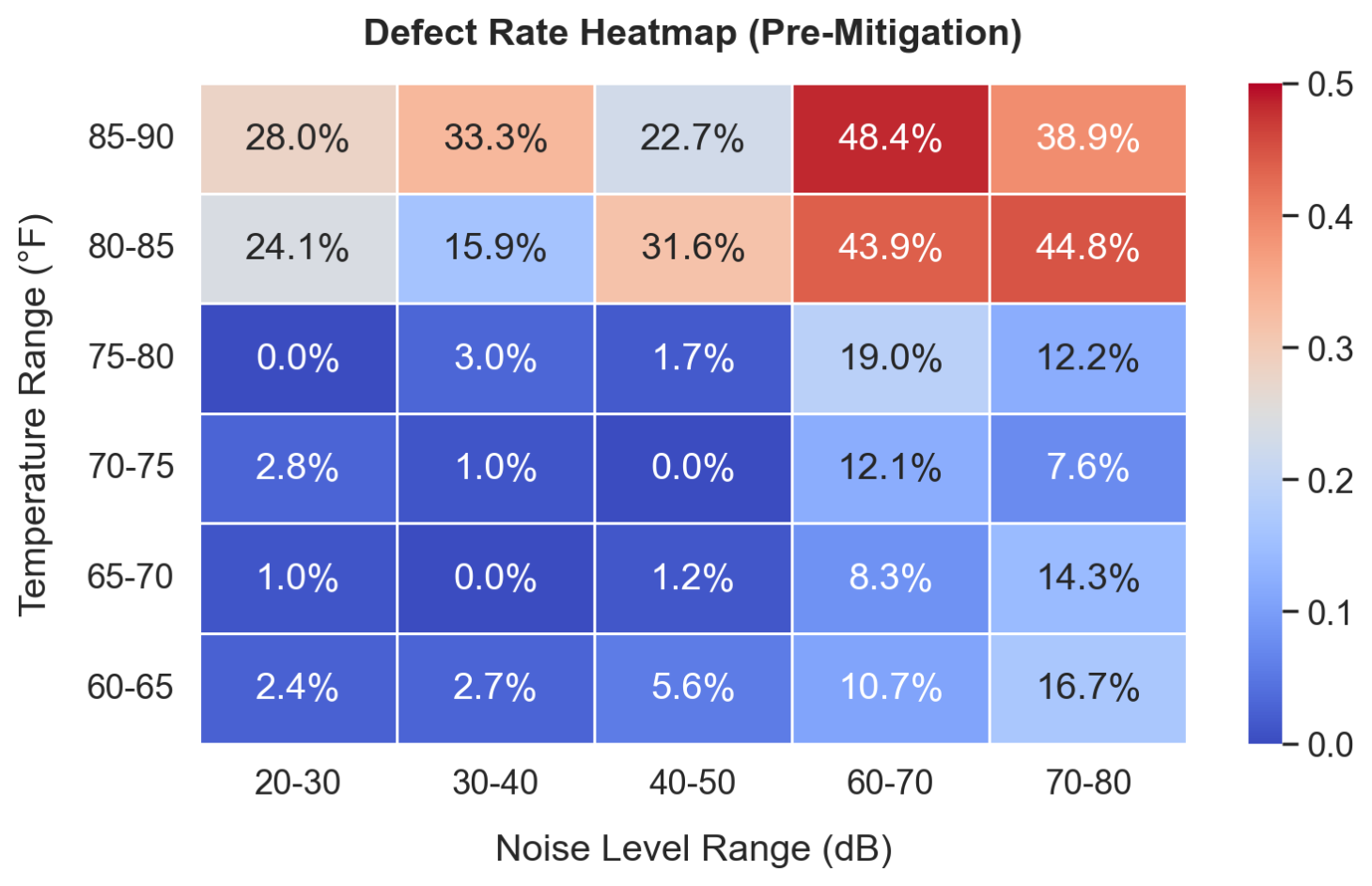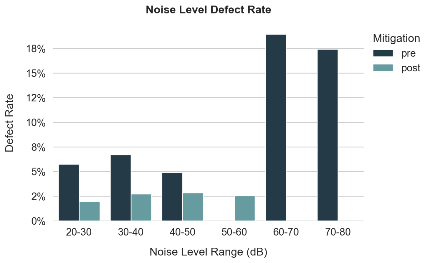 Pre-mitigation analysis revealed a sharp increase in defect rates above 60 dB, highlighting potential disruptions tied to ambient machinery noise.