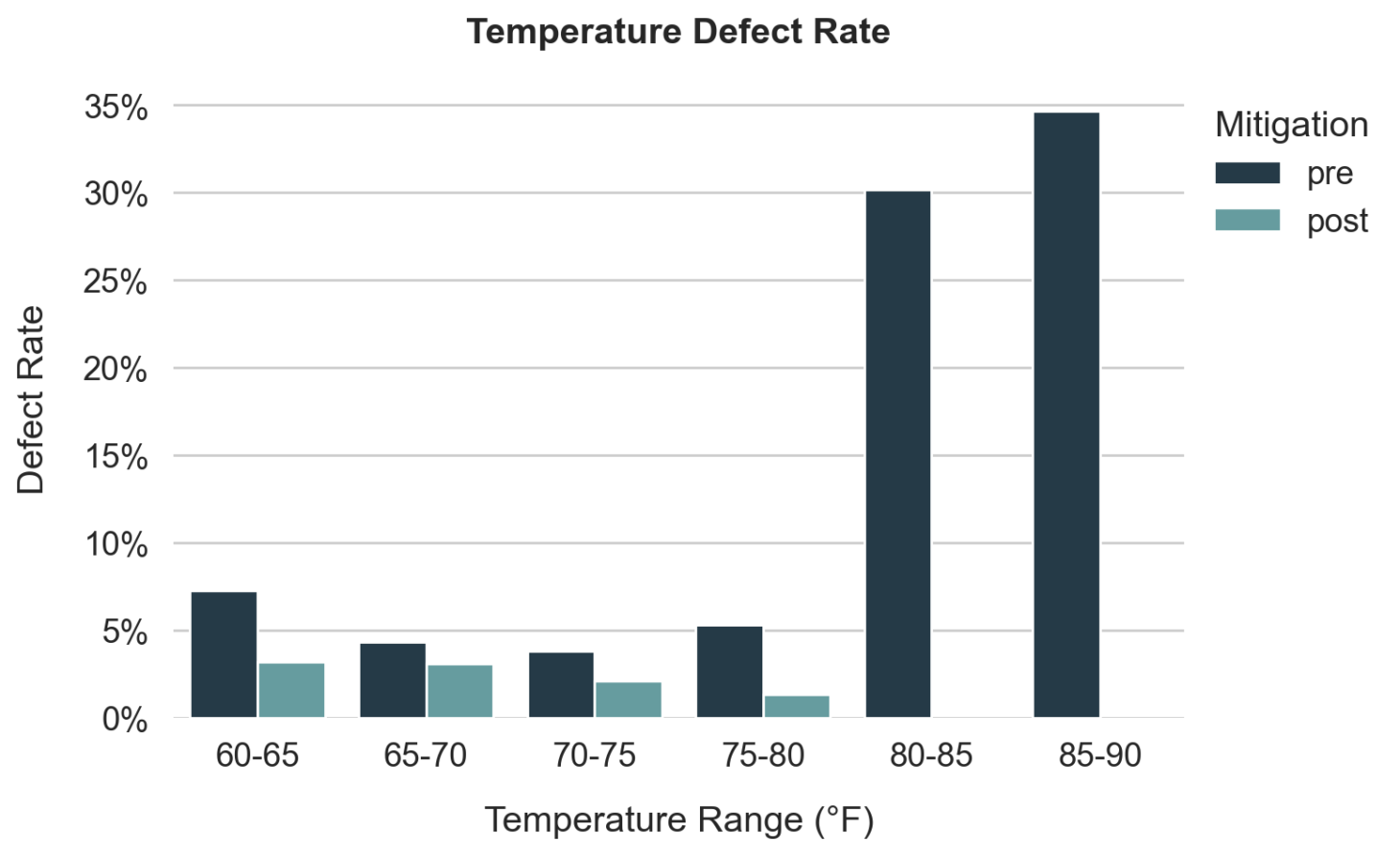 Defect rates increased significantly above 80°F prior to mitigation efforts, suggesting heat stress or other issues in the packing environment.