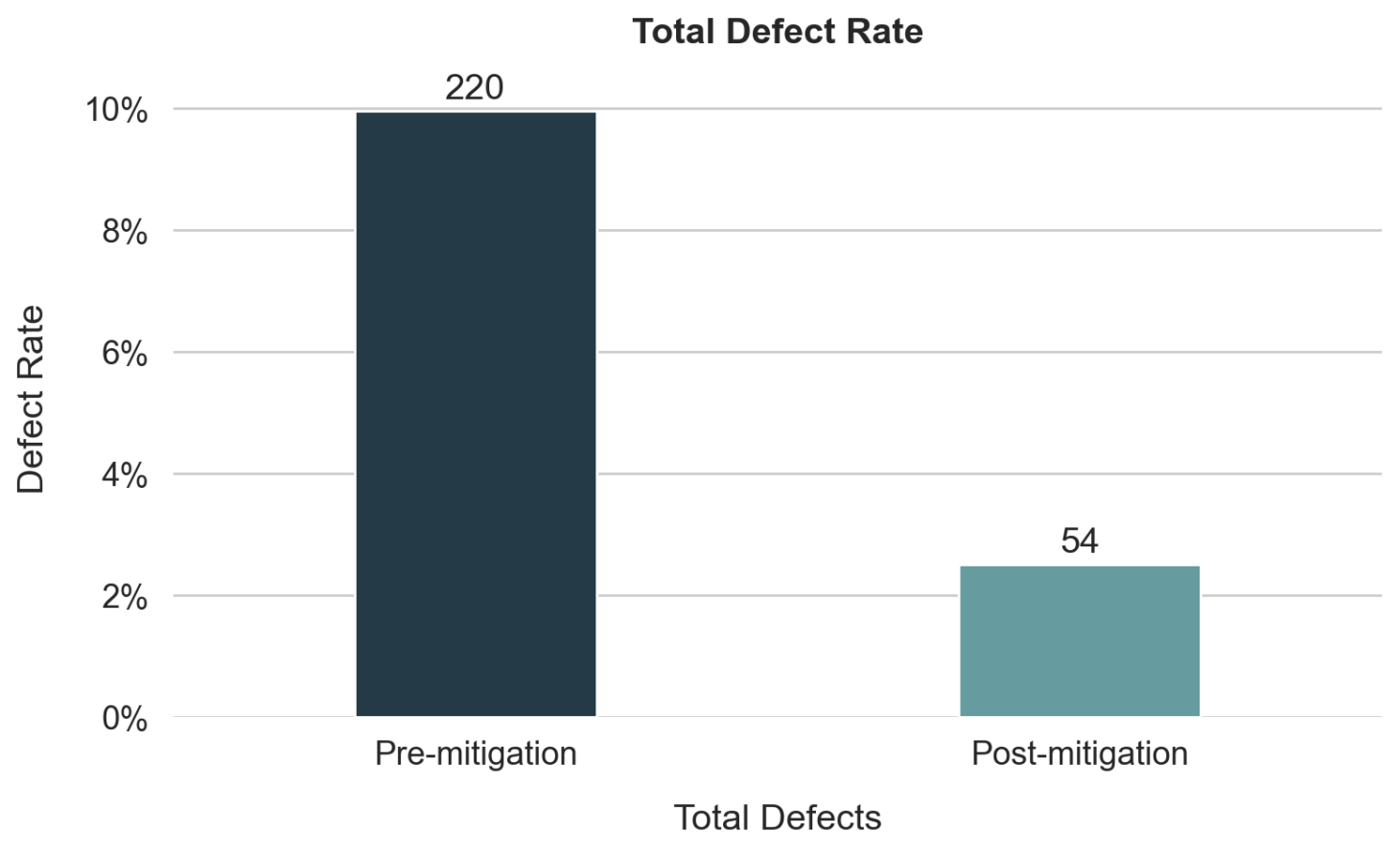 Post-mitigation defect rates dropped by over 75%, confirming the effectiveness of airflow, insulation, and acoustic damping upgrades.